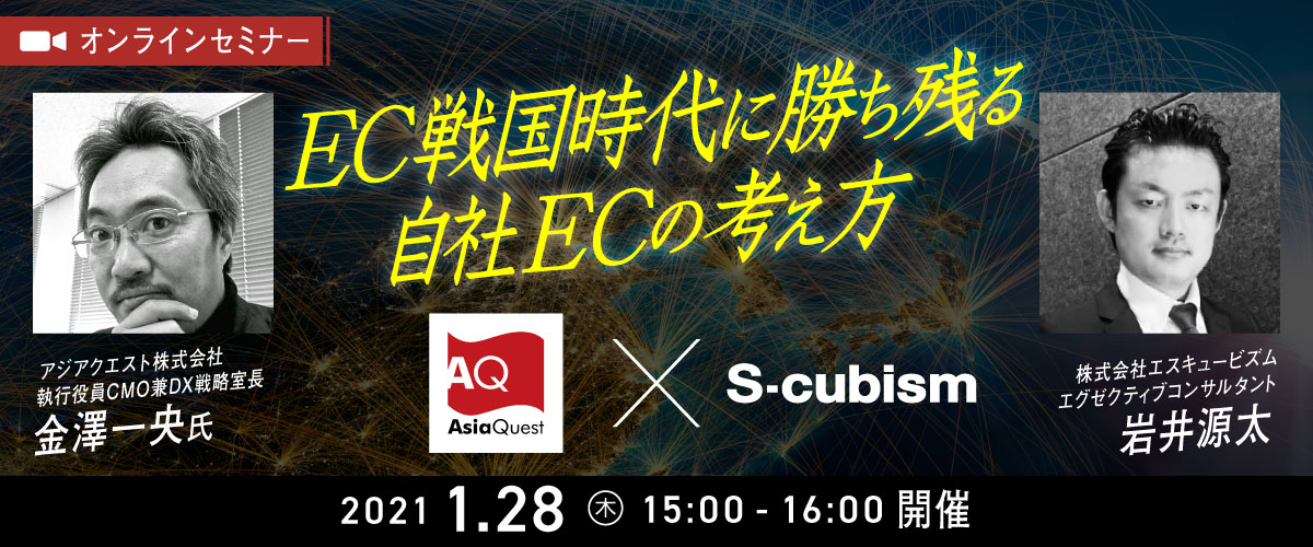 IoT、AI等のデジタル技術を活用して企業のデジタルトランスフォーメーション(以下、DX)を支援するアジアクエスト株式会社(本社所在地: 東京都千代田区飯田橋 代表取締役: 桃井純 以下、アジアクエスト)は株式会社エスキュービズム(本社所在地: 東京都港区芝公園 代表取締役:薮崎敬祐)と1月28日(木)にアフターコロナ時代のECに関するウェビナーを共催します。